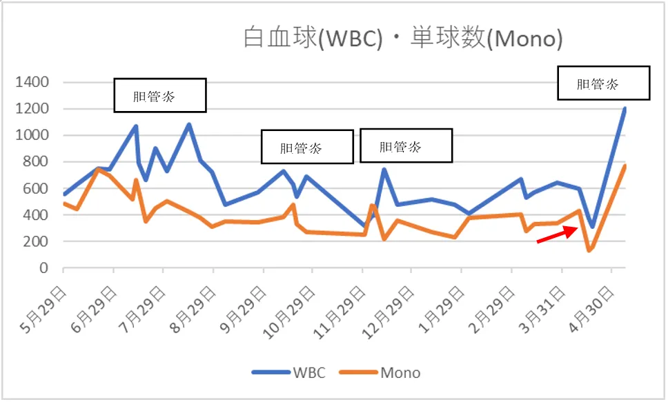 2023年4月より2024 年3月下旬まで化学療法施行。その後、全身状態悪化に伴い、白血球数は減少傾向であったが、上清液を3月下旬より開始してから単球数*の上昇傾向が見られ(→)、免疫能が回復してきた可能性が示唆された。4月に抗がん剤の副作用による白血球減少のあと、胆管炎を併発した。